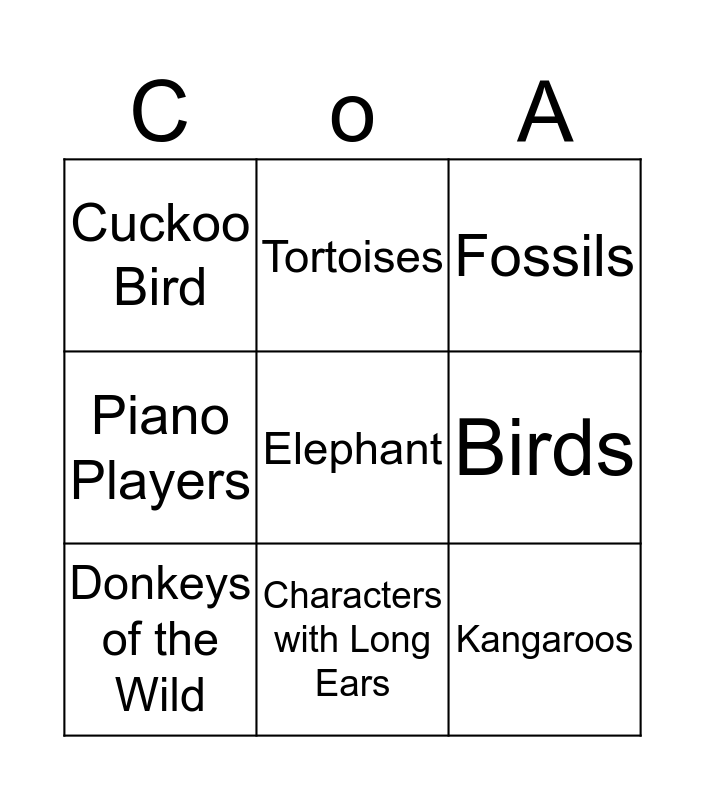 This bingo card has 13 words: Lion, Hens & Roosters, Donkeys of the Wild, Tortoises, Piano Players, Elephant, Kangaroos, Aquarium, Characters with Long Ears, Cuckoo Bird, Birds, Fossils and Swan.
