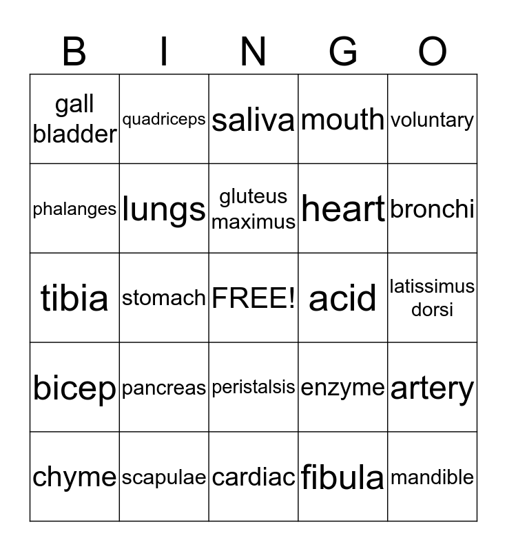 This bingo card has a free space and 24 words: pancreas, scapulae, gluteus maximus, chyme, voluntary, gall bladder, phalanges, quadriceps, acid, peristalsis, heart, tibia, enzyme, artery, lungs, fibula, latissimus dorsi, saliva, bronchi, stomach, mandible, bicep, mouth and cardiac.