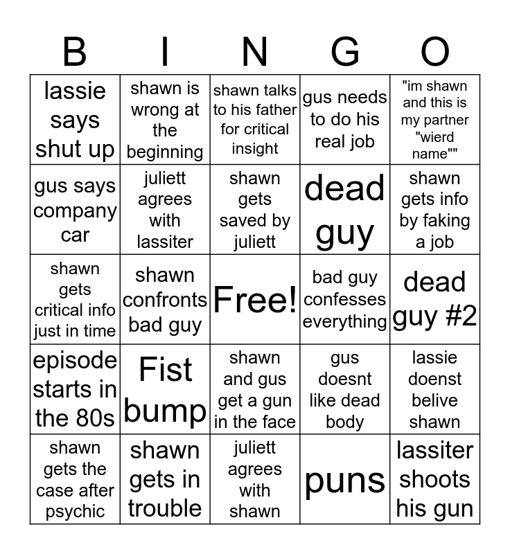 This bingo card has a free space and 24 words: Fist bump, shawn gets in trouble, shawn gets saved by juliett, shawn gets the case after psychic, "im shawn and this is my partner "wierd name"", lassie says shut up, gus says company car, shawn is wrong at the beginning, bad guy confesses everything, shawn and gus get a gun in the face, dead guy, shawn gets critical info just in time, gus doesnt like dead body, lassie doenst belive shawn, juliett agrees with lassiter, puns, dead guy #2, shawn talks to his father for critical insight, shawn gets info by faking a job, shawn confronts bad guy, lassiter shoots his gun, episode starts in the 80s, gus needs to do his real job and juliett agrees with shawn.