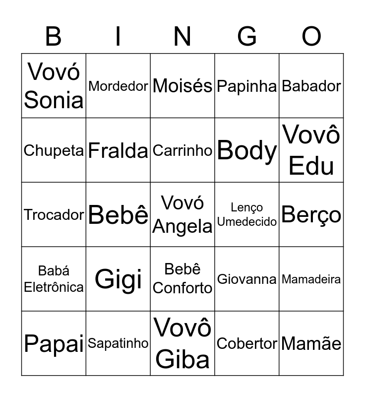 This bingo card has 25 words: Gigi, Vovô Giba, Carrinho, Papai, Babador, Vovó Sonia, Chupeta, Mordedor, Lenço Umedecido, Bebê Conforto, Body, Trocador, Giovanna, Mamadeira, Fralda, Mamãe, Berço, Moisés, Vovô Edu, Bebê, Vovó Angela, Sapatinho, Babá Eletrônica, Papinha and Cobertor.