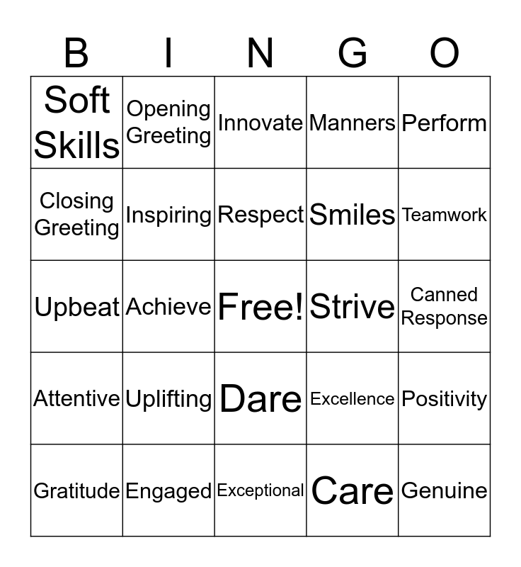 This bingo card has a free space and 26 words: Dare, Care, Respect, Engaged, Perform, Soft Skills, Closing Greeting, Opening Greeting, Canned Response, Excellence, Smiles, Upbeat, Positivity, Gratitude, Achieve, Polite, Manners, Attentive, Innovate, Genuine, Teamwork, Exceptional, Strive, Uplifting, Inspiring and Inspiring.