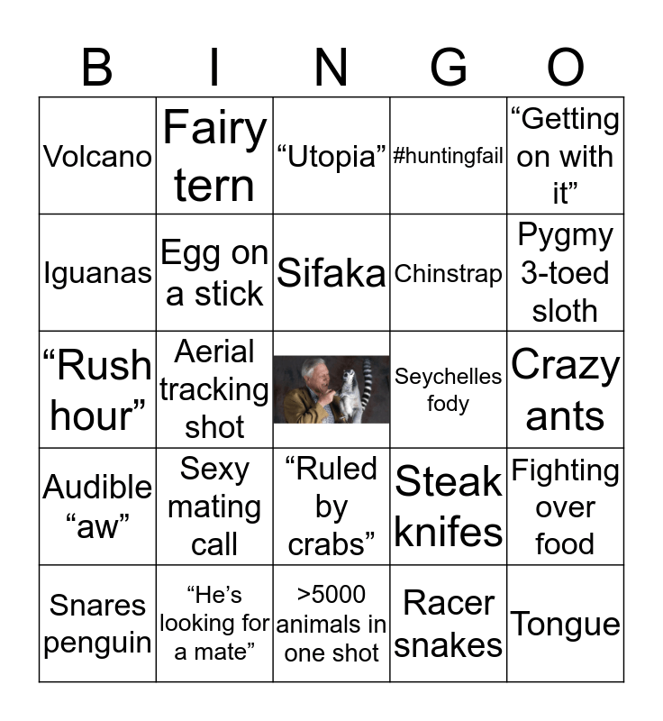 This bingo card has a free space and 24 words: Sexy mating call, “He’s looking for a mate”, Sifaka, Snares penguin, “Getting on with it”, Volcano, Iguanas, Fairy tern, Seychelles fody, “Ruled by crabs”, Chinstrap, “Rush hour”, Steak knifes, Fighting over food, Egg on a stick, Racer snakes, Crazy ants, “Utopia”, Pygmy 3-toed sloth, Aerial tracking shot, Tongue, Audible “aw”, #huntingfail and >5000 animals in one shot.