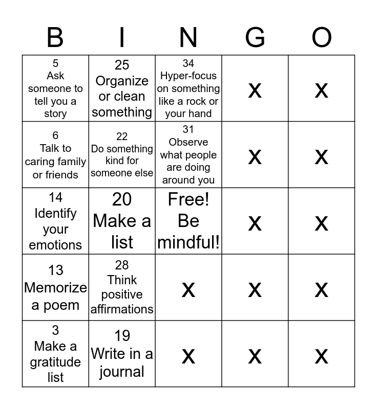 This bingo card has a free space and 74 words: 1 Write a letter to someone that you may never send, 16 Read a book or magazine, 31 Observe what people are doing around you, x, x, 2 Try to make as many words out of your full name as possible, 17 Say something kind to yourself, 32 Listen to music, x, x, 3 Make a gratitude list, 18 Write / tell a story, x, x, 4 Look at pretty things like flowers, animals, or art, 19 Write in a journal, 33 Hug a pillow or stuffed animal, x, x, 5 Ask someone to tell you a story, 20 Make a list, 34 Hyper-focus on something like a rock or your hand, x, x, 6 Talk to caring family or friends, 21 Smile at five people, 35 Visualize your favorite place, x, x, 7 Take deep breaths, 22 Do something kind for someone else, x, x, x, 8 Color, 23 Say “I can do this”, x, x, x, 9 Color-coordinate your wardrobe, 24 Stretch, x, x, x, 10 Take a bath or long shower, 25 Organize or clean something, x, x, x, 11 Let yourself cry, 26 Rip paper into tiny pieces, x, x, x, 12 Do a word puzzle, 27 Notice five things you can hear, x, x, x, 13 Memorize a poem, 28 Think positive affirmations, x, x, x, 14 Identify your emotions, 29 Exercise, x, x, x, 15 Go for a walk, 30 Try aromatherapy (with lotion, soap, shampoo, etc.), x, x and x.