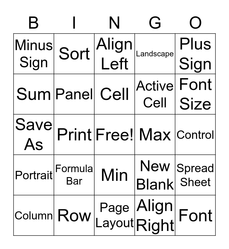 This bingo card has a free space and 24 words: Formula Bar, Row, Cell, Column, Plus Sign, Minus Sign, Sum, Sort, Max, Min, Active Cell, Save As, New Blank, Spread Sheet, Panel, Align Right, Control, Align Left, Font Size, Print, Font, Portrait, Landscape and Page Layout.