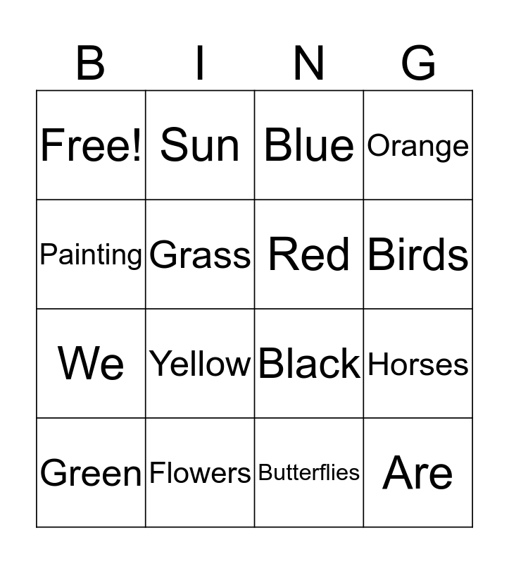 This bingo card has 16 words: Green, Flowers, Blue, Orange, Painting, Sun, Black, Horses, Free!, Grass, Butterflies, Birds, We, Yellow, Red and Are.