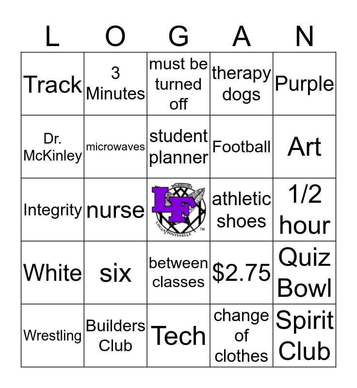 This bingo card has a free space and 52 words: some homework, Spirit Club, Living, Tech, six, Cross Country, 3 Minutes, Soup/Salad bar, Dr. McKinley, Mrs. Fenster, microwaves, volleyball, Quiz Bowl, $2.75, hotdog, Swimming, student planner, athletic shoes, Basketball, Purple, nurse, change of clothes, Track, Football, World Language, SOS, Valor, Warriors, Art, 3 numbers, 3 books, therapy dogs, electives & passing, FCA, lunch of the day, must be turned off, Builders Club, 2nd Floor, sports physical, in the library, Mr. Schaefer, 1/2 hour, White, 8:30 - 3:55, between classes, Diversity Club, sub sandwiches, Integrity, pizza, daily announce-ments, Wrestling and main office.