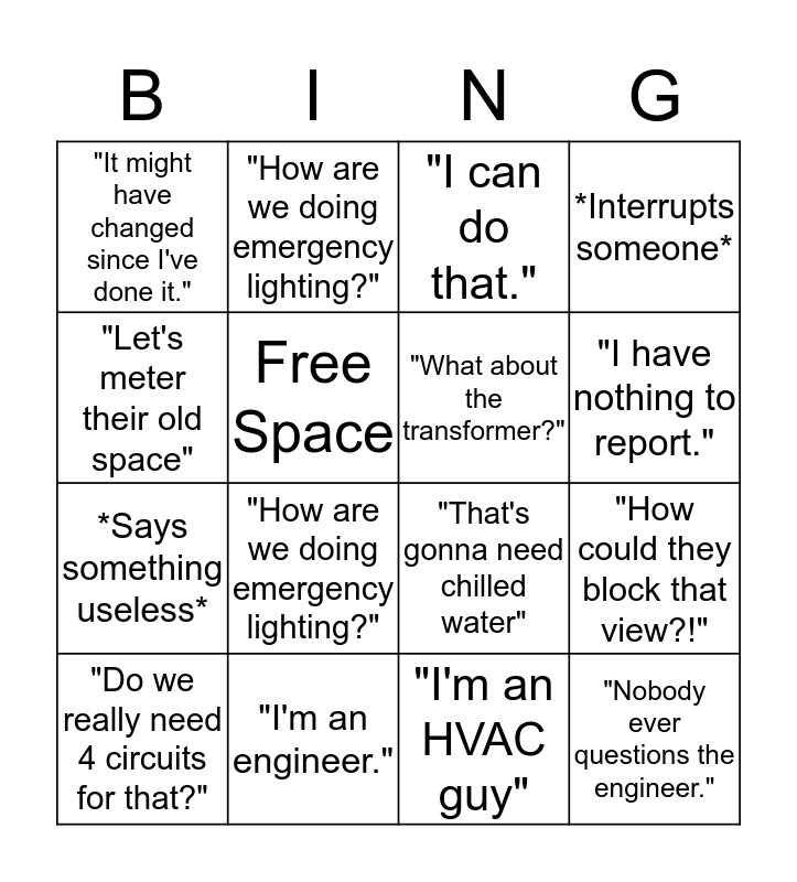 This bingo card has 16 words: "I'm an engineer.", "How could they block that view?!", "I can do that.", "It might have changed since I've done it.", *Says something useless*, "How are we doing emergency lighting?", "That's gonna need chilled water", "I'm an HVAC guy", "Let's meter their old space", Free Space, "Do we really need 4 circuits for that?", *Interrupts someone*, "How are we doing emergency lighting?", "I have nothing to report.", "What about the transformer?" and "Nobody ever questions the engineer.".