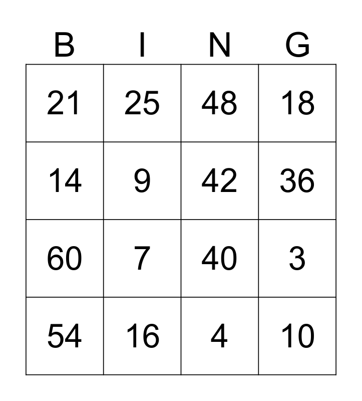 This bingo card has 16 words: 16, 3, 48, 21, 60, 25, 40, 4, 14, 9, 54, 18, 7, 36, 42 and 10.
