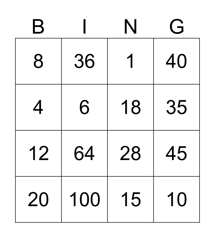 This bingo card has 16 words: 100, 45, 1, 8, 12, 36, 28, 15, 4, 6, 20, 40, 64, 35, 18 and 10.
