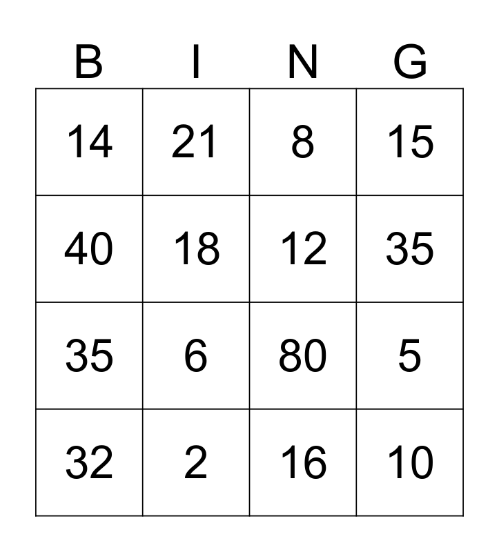 This bingo card has 16 words: 2, 5, 8, 14, 35, 21, 80, 16, 40, 18, 32, 15, 6, 35, 12 and 10.