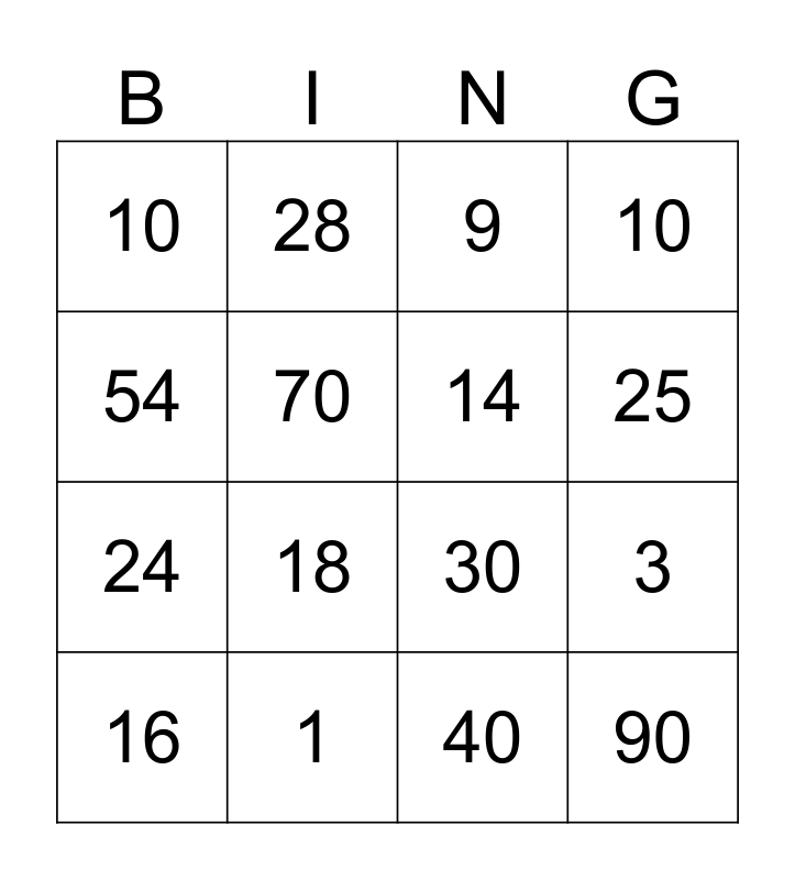 This bingo card has 16 words: 1, 3, 9, 10, 24, 28, 30, 40, 54, 70, 16, 10, 18, 25, 14 and 90.
