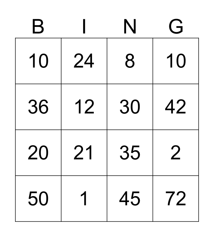This bingo card has 16 words: 1, 2, 8, 10, 20, 24, 35, 45, 36, 12, 50, 10, 21, 42, 30 and 72.