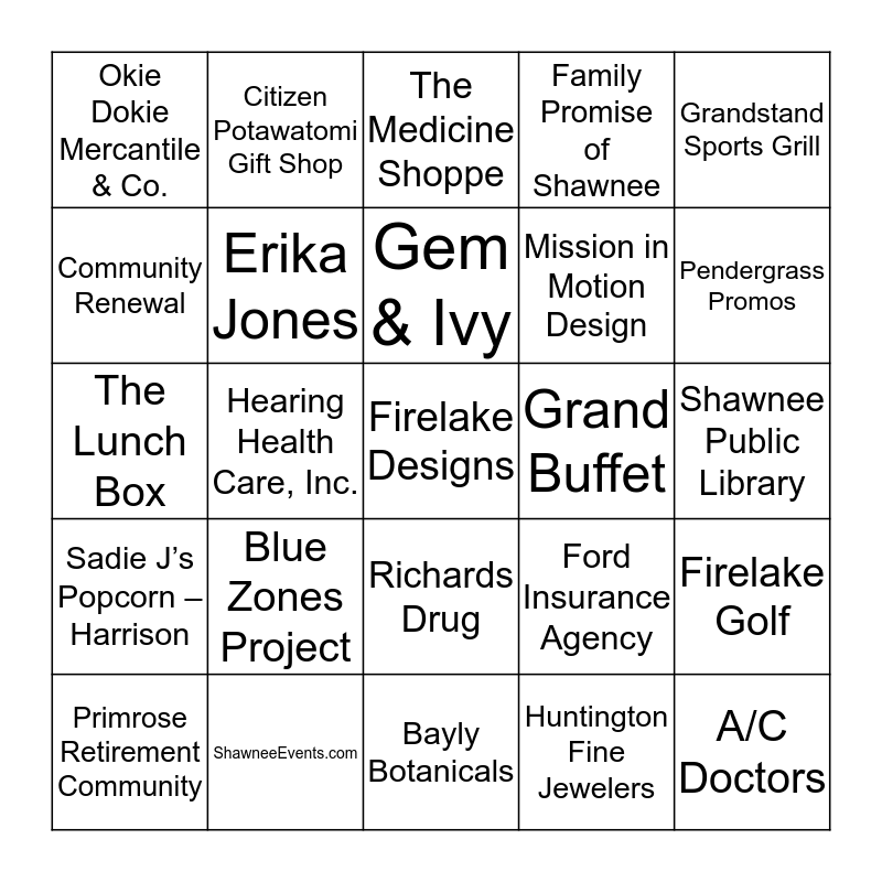 This bingo card has a free space and 49 words: Action Physical Therapy, A/C Doctors, BancFirst, Bayly Botanicals, Blue Zones Project, CBD American Shaman, Citizen Potawatomi Gift Shop, Coffee N’ Crafts, Community Renewal, Cuckoo Bird & Dashing T, Erika Jones, Family Promise of Shawnee, Firelake Golf, Ford Insurance Agency, Flame, Gordon Cooper Technology Center, Gem & Ivy, Grand Buffet, Grand Cafe, Grandstand Sports Grill, Hearing Health Care, Inc., Huntington Fine Jewelers, Okie Dokie Mercantile & Co., Mission in Motion Design, Patty Wagstaff, Realtor, Pendergrass Promos, Primrose Retirement Community, Puro Clean of Midwest City, Richards Drug, Sadie J’s Popcorn – Harrison, Sadie J’s Popcorn – Shawnee Mall, Sand Dune Recording Studio, Saya Thai, Shawnee Country Club, ShawneeEvents.com, Shawnee Forward, Shawnee News-Star, Shawnee Outdoors, Shawnee Public Library, Shelter Insurance – Denoda Rutherford, Theopolis Social Club, Soto Sushi, The Garage Burgers & Beer, The Grand Spa, The Lunch Box, The Medicine Shoppe, Visit Shawnee, Vyve Broadband and Wystle.