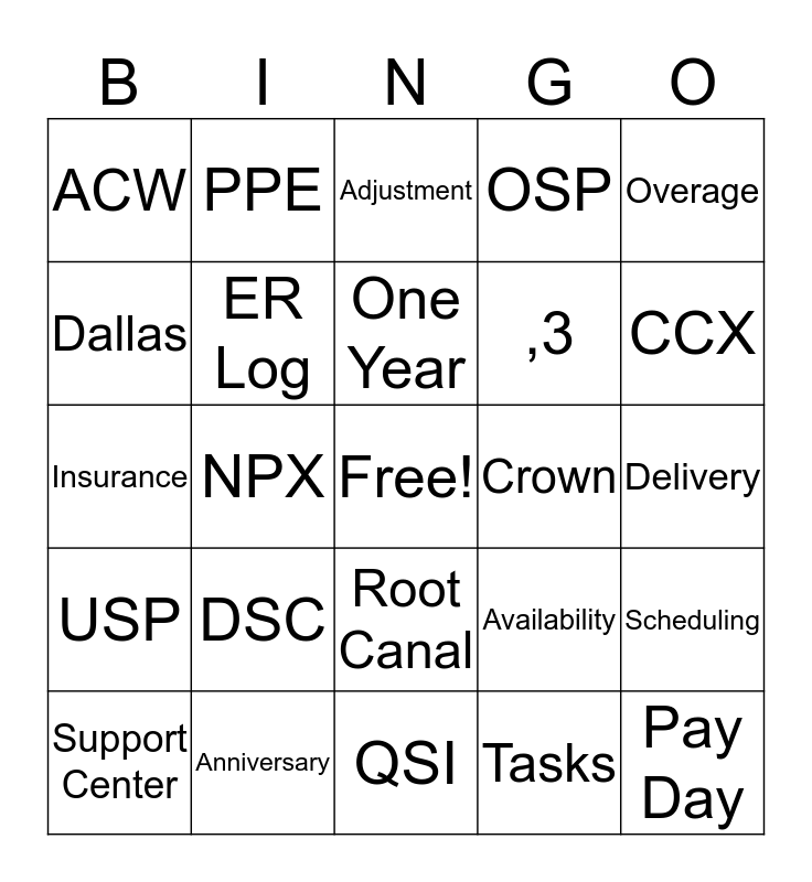 This bingo card has a free space and 24 words: DSC, Anniversary, One Year, Support Center, Overage, ACW, Dallas, PPE, Crown, Root Canal, ,3, Insurance, Availability, Scheduling, ER Log, Tasks, Delivery, Adjustment, CCX, NPX, Pay Day, USP, OSP and QSI.