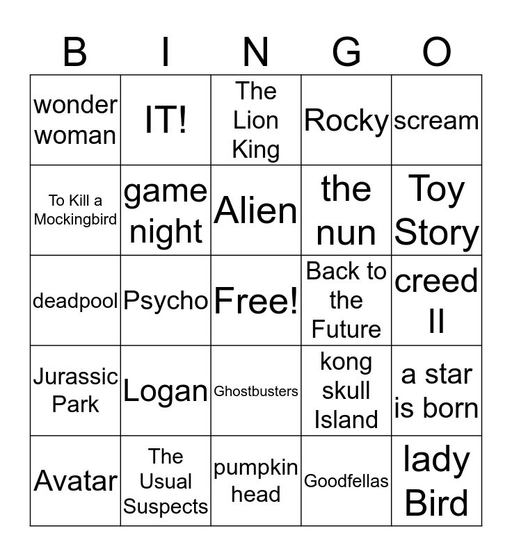 This bingo card has a free space and 115 words: Bonnie and Clyde, Reservoir Dogs, Pan's Labyrinth, Close Encounters of the Third Kind, Up, 100, Rocky, Braveheart, Slumdog Millionaire, The Lord of the Rings: The Return of the King, Beauty and the Beast, Seven, Inception, Die Hard, The Lord of the Rings: The Fellowship of the Ring, Wall-E, Ghostbusters, Young Frankenstein, Almost Famous, Gladiator, Avatar, The Lion King, West Side Story, Taxi Driver, Good Will Hunting, Jurassic Park, The Usual Suspects, Saving Private Ryan, Titanic, The Matrix, Toy Story, Alien, Psycho, Fight Club, The Shining, When Harry Met Sally, Ferris Bueller's Day Off, Fargo, The Princess Bride, One Flew Over the Cuckoo's Nest, Blade Runner, The Breakfast Club, Singin' in the Rain, The Sound of Music, Jaws, The Silence of the Lambs, Goodfellas, To Kill a Mockingbird, Gone With the Wind, Forrest Gump, Raiders of the Lost Ark, Back to the Future, Star Wars, Schindler's List, E.T. The Extra-Terrestrial, Pulp Fiction, The Wizard of Oz, The Godfather, The Ring, a quiet place, a star is born, black panther, avengers: infinity war, hereditary, venom, ready player, bohemian rhapsody, game night, deadpool, halloween, creed II, Upgrade, US, get out, thor: ragnarok, lady Bird, Logan, wonder woman, baby driver, mudbound, john wick, IT!, Molly's Games, kong skull Island, the nun, insidious, bird box, the dark knight, kill bill, deathproof, cast away, sin city, little miss sunshine, the sixth sense, scream, the blair witch project, speed, dazed and confused, the goonies, top gun, dirty dancing, the lost boys, loose, beetlejuice, poltergeist, a nightmare on Elm Street, the fly, child's play, pumpkin head, candyman, i know what you did last summer, the craft, tremors, arachnophobia and madmax fury road.