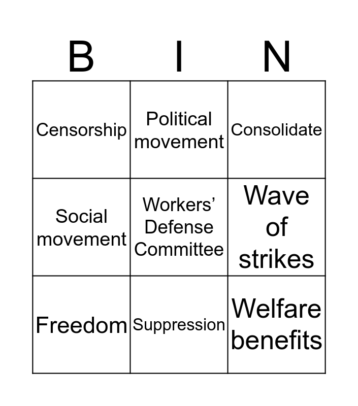 This bingo card has 15 words: Trade Union, Solidarity, Consolidate, Censorship, Suppression, Workers’ Defense Committee, Coalition government, Semi-free elections, Wave of strikes, Welfare benefits, Independent, Social movement, Freedom, Political movement and Revolution.