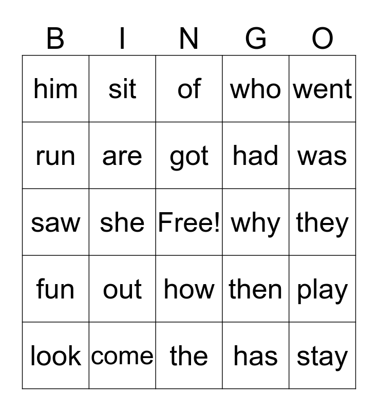 This bingo card has a free space and 24 words: out, come, got, look, went, him, run, sit, why, how, had, saw, then, play, are, has, they, of, was, she, stay, fun, who and the.