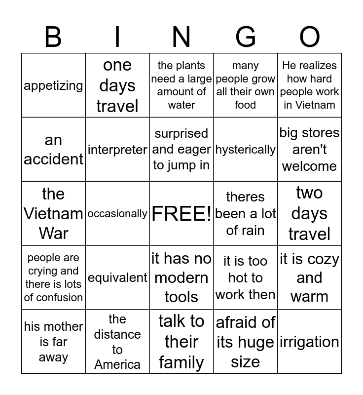 This bingo card has a free space and 24 words: equivalent, the distance to America, surprised and eager to jump in, his mother is far away, He realizes how hard people work in Vietnam, appetizing, an accident, one days travel, theres been a lot of rain, it has no modern tools, hysterically, the Vietnam War, it is too hot to work then, it is cozy and warm, interpreter, afraid of its huge size, two days travel, the plants need a large amount of water, big stores aren't welcome, occasionally, irrigation, people are crying and there is lots of confusion, many people grow all their own food and talk to their family.
