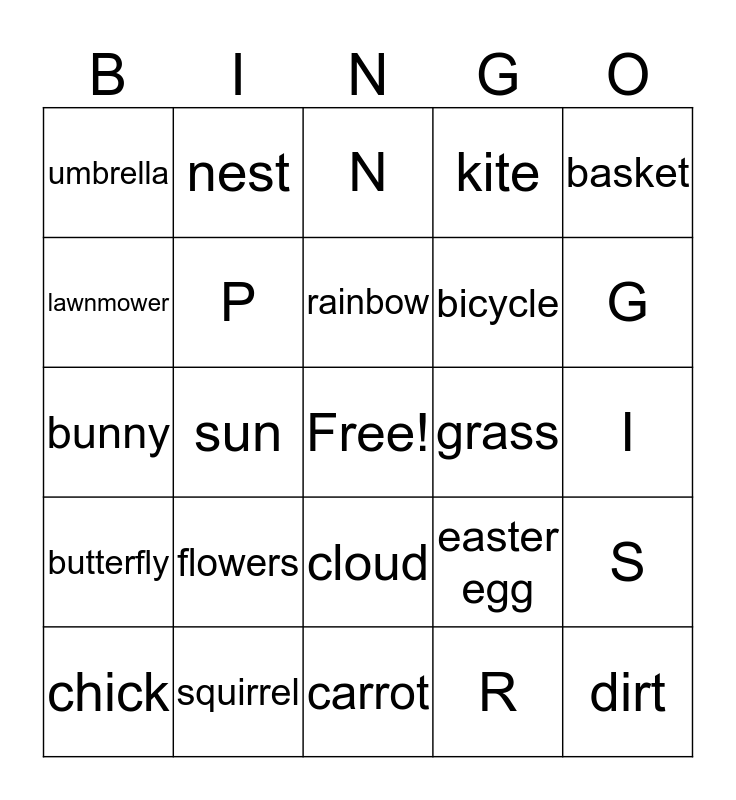 This bingo card has a free space and 24 words: flowers, squirrel, rainbow, chick, basket, umbrella, lawnmower, nest, grass, cloud, bicycle, bunny, easter egg, S, P, R, I, N, G, sun, dirt, butterfly, kite and carrot.