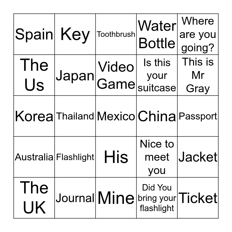 This bingo card has a free space and 29 words: The UK, Suitcase, Thailand, Camera, Spain, Toothbrush, Japan, Flashlight, China, Journal, Passport, Ticket, Mine, Did You bring your flashlight, This is Mr Gray, Brazil, His, Australia, Where are you going?, Korea, Nice to meet you, Her, Is this your suitcase, The Us, Water Bottle, Key, Jacket, Video Game and Excuse me..