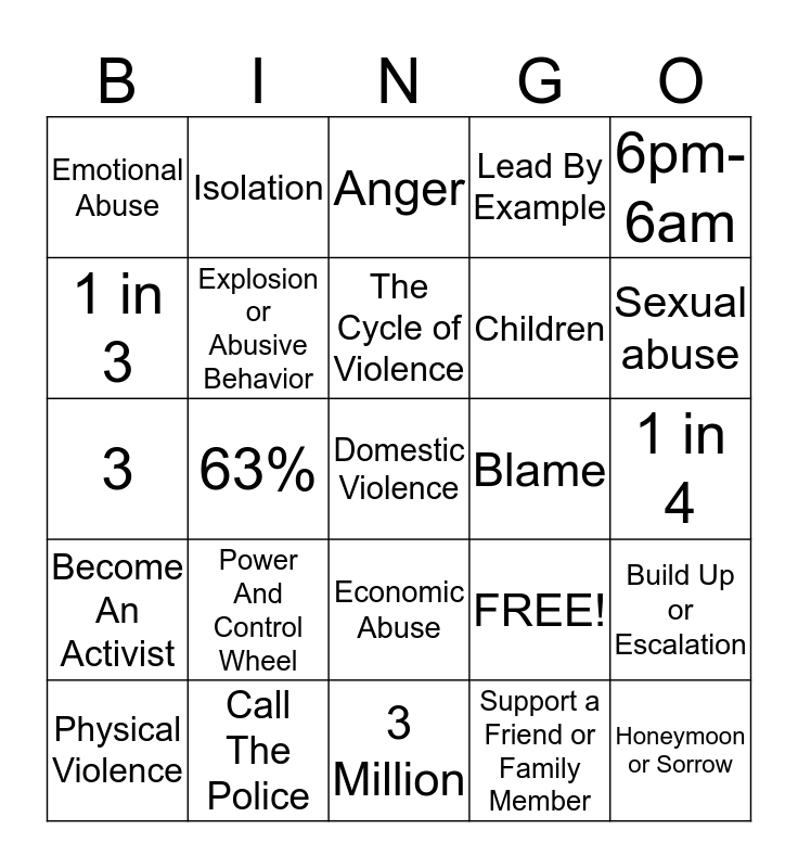 This bingo card has 25 words: Power And Control Wheel, 3 Million, The Cycle of Violence, Physical Violence, 6pm-6am, Emotional Abuse, 1 in 3, Isolation, Blame, Economic Abuse, Children, 3, FREE!, Build Up or Escalation, Explosion or Abusive Behavior, Honeymoon or Sorrow, 1 in 4, Anger, Sexual abuse, 63%, Domestic Violence, Call The Police, Become An Activist, Lead By Example and Support a Friend or Family Member.