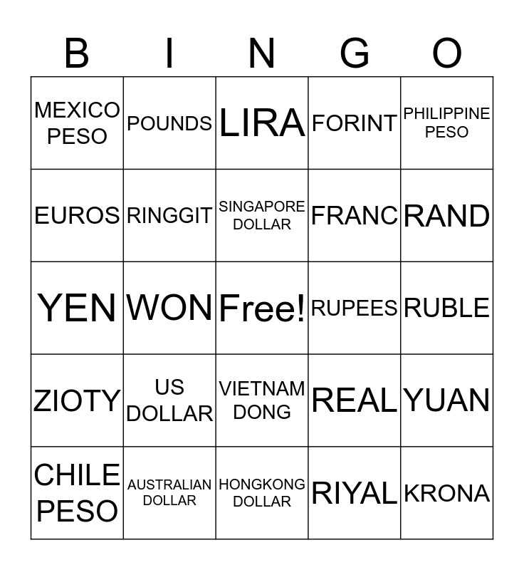 This bingo card has a free space and 24 words: US DOLLAR, AUSTRALIAN DOLLAR, SINGAPORE DOLLAR, CHILE PESO, PHILIPPINE PESO, MEXICO PESO, EUROS, POUNDS, RUPEES, VIETNAM DONG, FRANC, YEN, REAL, YUAN, RINGGIT, RIYAL, RUBLE, LIRA, RAND, WON, KRONA, ZIOTY, FORINT and HONGKONG DOLLAR.