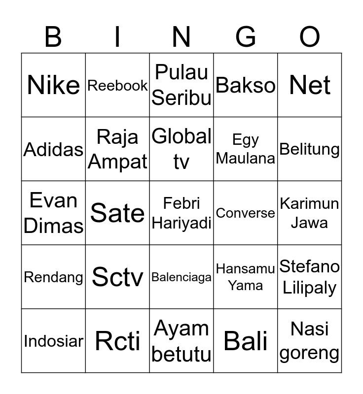 This bingo card has a free space and 24 words: Sctv, Rcti, Global tv, Indosiar, Net, Nike, Adidas, Reebook, Converse, Balenciaga, Egy Maulana, Evan Dimas, Hansamu Yama, Stefano Lilipaly, Raja Ampat, Bali, Karimun Jawa, Pulau Seribu, Belitung, Sate, Nasi goreng, Rendang, Bakso and Ayam betutu.