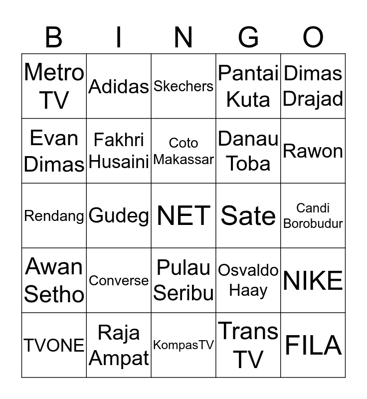 This bingo card has a free space and 24 words: Converse, Raja Ampat, Coto Makassar, TVONE, Dimas Drajad, Metro TV, Evan Dimas, Adidas, Sate, Pulau Seribu, Danau Toba, Rendang, Osvaldo Haay, NIKE, Fakhri Husaini, Trans TV, Candi Borobudur, Skechers, Rawon, Gudeg, FILA, Awan Setho, Pantai Kuta and KompasTV.