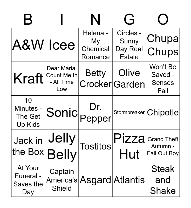 This bingo card has 68 words: Fanta, Dr. Pepper, Arby’s, Burger King, Panera, Dairy Queen, Icee, Dunkin Donuts, Betty Crocker, Juicy Fruit, Tostitos, Cracker Barrel, Chipotle, Chupa Chups, Warheads, Kraft, Sonic, A&W, In-N-Out Burger, Jelly Belly, Olive Garden, Pizza Hut, Jack in the Box, Steak and Shake, Oscar Mayer, Hands Down - Dashboard Confessional, Title and Registration - Death Cab for Cutie, Cute Without the E - Taking Back Sunday, Grand Theft Autumn - Fall Out Boy, I Write Sins Not Tragedies - Panic! At the Disco, Helena - My Chemical Romance, El Scorcho - Weezer, Sweetness - Jimmy Eat World, The Quiet Things - Brand New, Circles - Sunny Day Real Estate, The Taste of Ink - The Used, Misery Business - Paramore, At Your Funeral - Saves the Day, Won’t Be Saved - Senses Fail, 10 Minutes - The Get Up Kids, Ohio is for Lovers - Hawthorne Heights, Dramamine - Modest Mouse, Dear Maria, Count Me In - All Time Low, I’d Do Anything - Simple Plan, Your Graduation - Modern Baseball, Arc Reactor, Tesseract, Infinity Stones, Stormbreaker, Captain America’s Shield, Shazam!, Fistigons, Vibranioum, Asgard, Ego, Adamantium, Atlantis, Arkham Asylum, Batcave, Daily Planet, S.T.A.R. Labs, Gotham, Lasso of Hestia, The Daily Bugle, Kryptonite, Power Ring, Wakanda and Mjolnir.