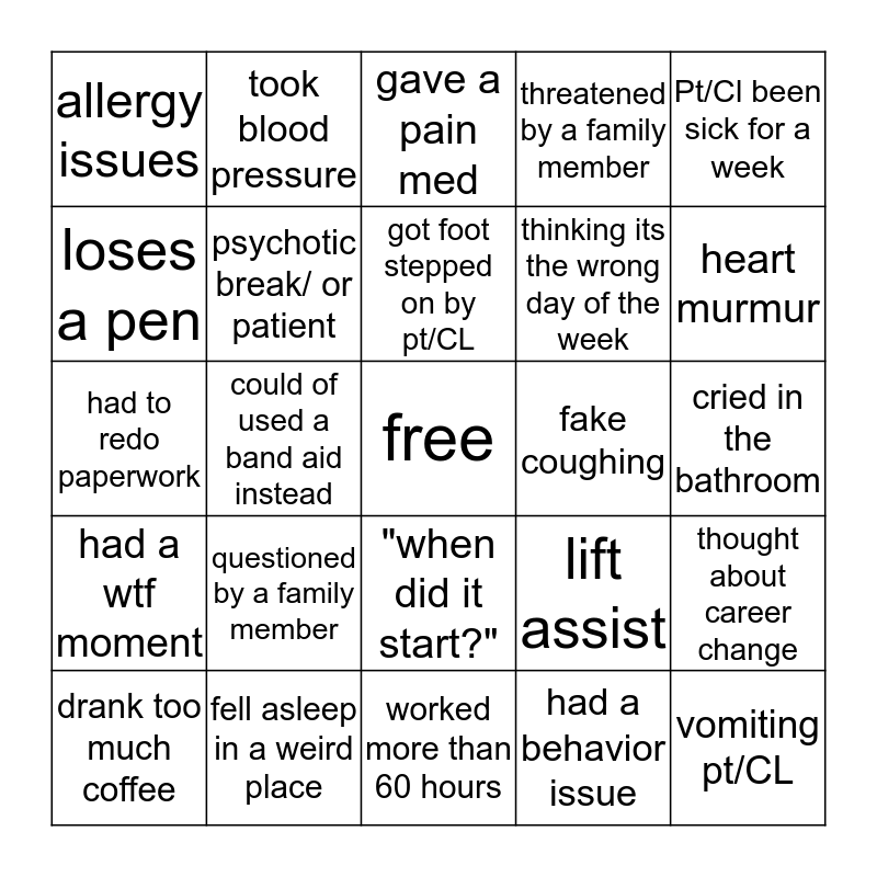 This bingo card has a free space and 27 words: lift assist, wanted to punch pt/CL, thinking its the wrong day of the week, worked more than 60 hours, loses a pen, gave a pain med, took blood pressure, had a wtf moment, fake coughing, thought about career change, had to redo paperwork, threatened by a family member, drank too much coffee, fell asleep in a weird place, heart murmur, ate lunch too fast, psychotic break/ or patient, got foot stepped on by pt/CL, questioned by a family member, allergy issues, cried in the bathroom, had a behavior issue, could of used a band aid instead, vomiting pt/CL, "when did it start?", Pt/Cl been sick for a week and loud pt/CL.