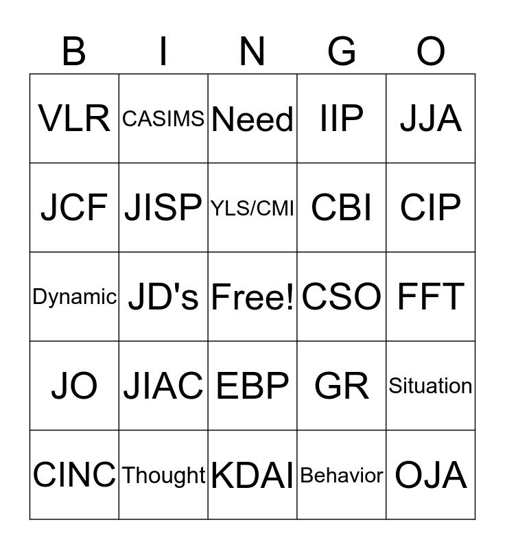 This bingo card has a free space and 39 words: PEI, EPICS II, JDC, JISP, CINC, EBP, YLS/CMI, KDOC, JJA, JO, JD's, IIP, OJA, FFT, CSO, JIAC, DCF, VLR, CO, GR, JCF, KDAI, CBI, CIP, Sanctions, Incentives, Stages of Change, SB 367, Program Hours, CASIMS, Fidelity, Risk, Need, Thought, Behavior, Emotion, Situation, Dynamic and Static.