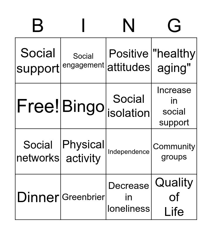 This bingo card has 16 words: Greenbrier, Community groups, Positive attitudes, Social support, Social networks, Social engagement, Independence, Decrease in loneliness, Free!, Bingo, Dinner, "healthy aging", Physical activity, Increase in social support, Social isolation and Quality of Life.
