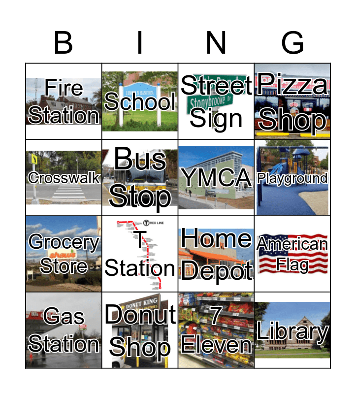 This bingo card has 16 images and 16 words: Donut Shop, American Flag, Street Sign, Fire Station, Grocery Store, School, Home Depot, 7 Eleven, Crosswalk, Bus Stop, Gas Station, Pizza Shop, T Station, Playground, YMCA and Library.