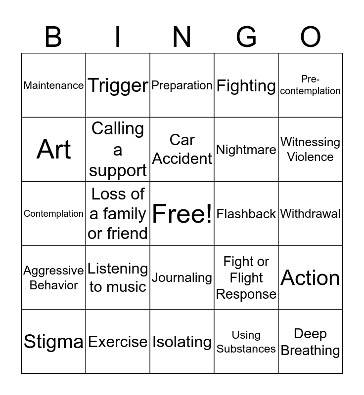 This bingo card has a free space and 24 words: Listening to music, Exercise, Car Accident, Stigma, Pre-contemplation, Maintenance, Art, Trigger, Flashback, Journaling, Nightmare, Contemplation, Fight or Flight Response, Action, Calling a support, Using Substances, Withdrawal, Preparation, Witnessing Violence, Loss of a family or friend, Deep Breathing, Aggressive Behavior, Fighting and Isolating.