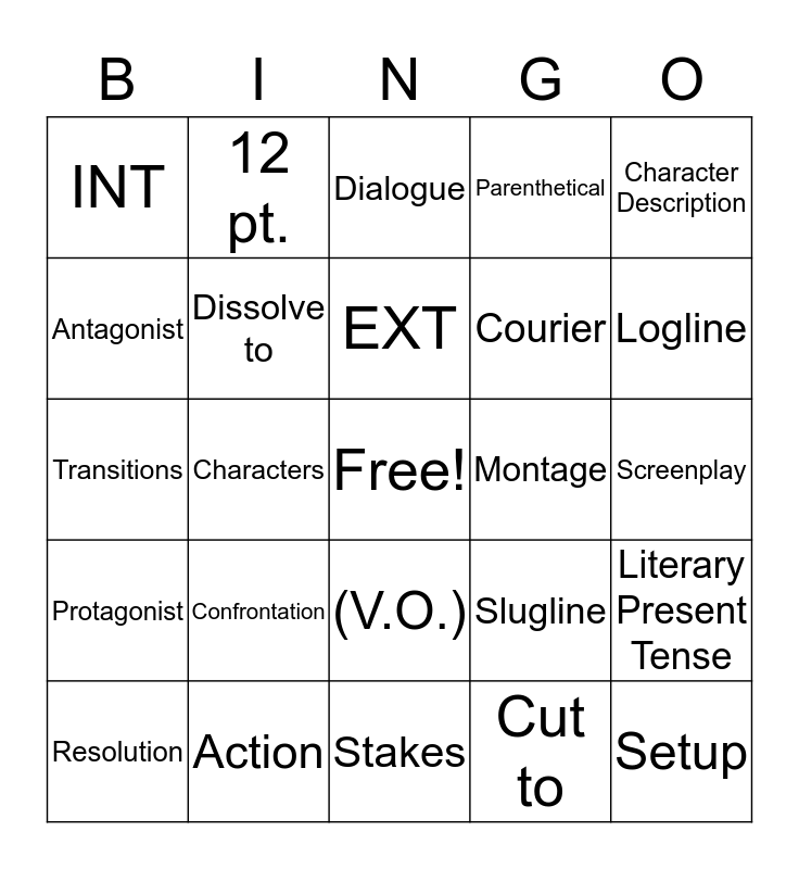 This bingo card has a free space and 24 words: Confrontation, Action, EXT, Resolution, Character Description, INT, Antagonist, 12 pt., Montage, (V.O.), Courier, Transitions, Slugline, Literary Present Tense, Dissolve to, Cut to, Screenplay, Dialogue, Logline, Characters, Setup, Protagonist, Parenthetical and Stakes.