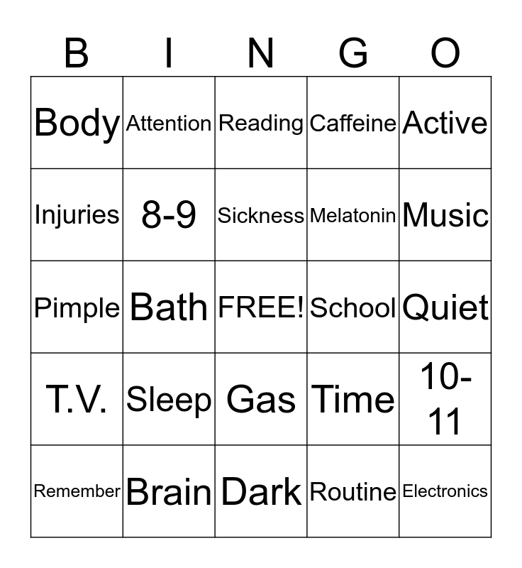 This bingo card has a free space and 24 words: Sleep, Brain, Sickness, Remember, Active, Body, Injuries, Attention, School, Gas, Melatonin, Pimple, Time, 10-11, 8-9, Routine, Quiet, Reading, Music, Bath, Electronics, T.V., Caffeine and Dark.