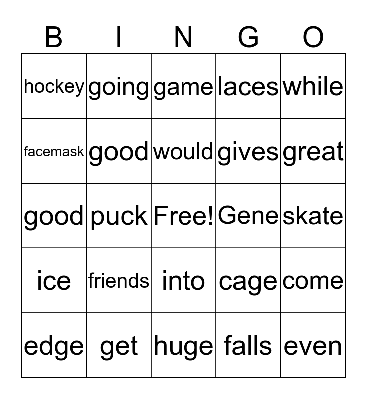 This bingo card has a free space and 27 words: cage, can't, gives, huge, facemask, game, going, ice, Gene, come, good, laces, edge, get, great, twice, good, would, friends, hockey, skate, falls, puck, even, into, while and if.