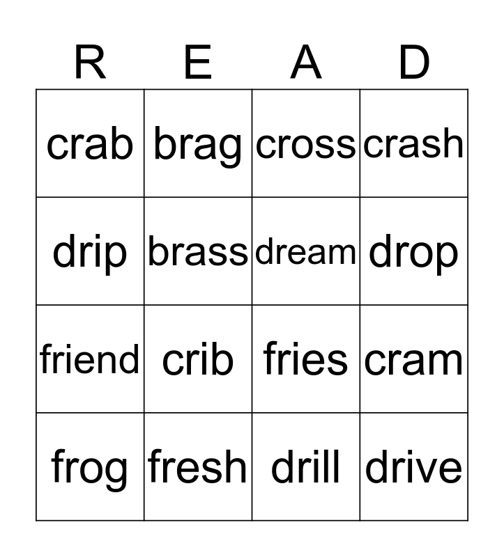 This bingo card has 20 words: cram, brand, cross, drag, frog, drip, fresh, crab, friend, brag, crib, fries, brass, drive, dream, freeze, drop, crash, drill and brain.