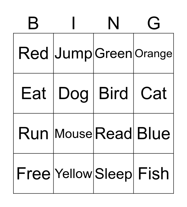 This bingo card has 16 words: Yellow, Blue, Green, Red, Run, Jump, Read, Sleep, Eat, Dog, Free, Orange, Mouse, Cat, Bird and Fish.