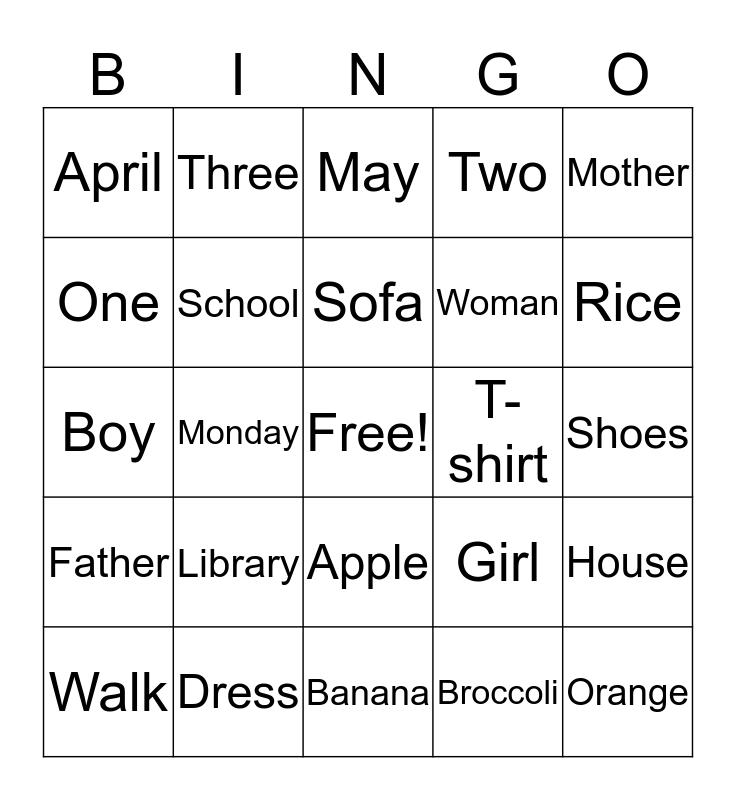 This bingo card has a free space and 29 words: Walk, Saturday, Monday, Friday, April, May, School, Library, T-shirt, Dress, Shoes, Orange, Banana, Broccoli, Rice, Run, Apple, Father, Mother, Boy, Girl, Man, Woman, One, Two, Three, House, Sofa and Bed.