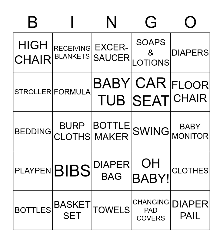 This bingo card has 25 words: BIBS, TOWELS, BABY TUB, BOTTLES, DIAPERS, HIGH CHAIR, STROLLER, RECEIVING BLANKETS, SWING, DIAPER BAG, CAR SEAT, BEDDING, OH BABY!, CLOTHES, FORMULA, DIAPER PAIL, BABY MONITOR, EXCER- SAUCER, FLOOR CHAIR, BURP CLOTHS, BOTTLE MAKER, BASKET SET, PLAYPEN, SOAPS & LOTIONS and CHANGING PAD COVERS.