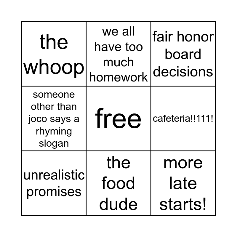 This bingo card has a free space and 11 words: i want to be the vOICE of the students, the food dude, more late starts!, unrealistic promises, we all have too much homework, fair honor board decisions, cafeteria!!111!, someone goes off script, someone other than joco says a rhyming slogan, the whoop and sLEep.