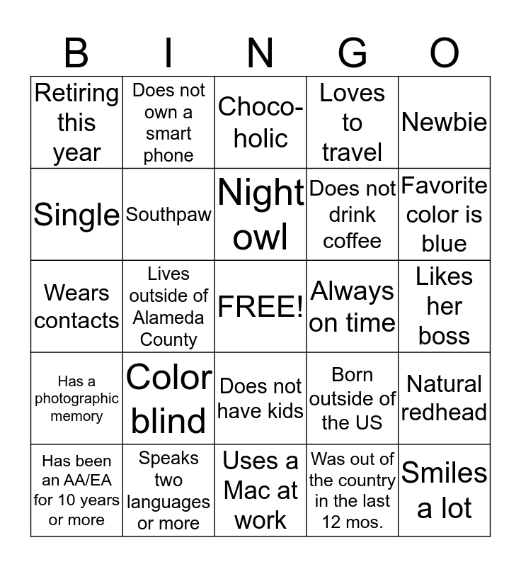 This bingo card has a free space and 24 words: Color blind, Speaks two languages or more, Night owl, Has been an AA/EA for 10 years or more, Newbie, Retiring this year, Single, Does not own a smart phone, Always on time, Does not have kids, Does not drink coffee, Wears contacts, Born outside of the US, Natural redhead, Southpaw, Was out of the country in the last 12 mos., Likes her boss, Choco-holic, Favorite color is blue, Lives outside of Alameda County, Smiles a lot, Has a photographic memory, Loves to travel and Uses a Mac at work.