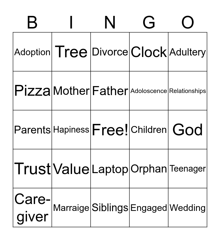 This bingo card has a free space and 29 words: Family, Marraige, Divorce, Intermarraige, Adultery, Adoption, Mother, Father, Children, Teenager, Care-giver, Hapiness, Engaged, Wedding, Parents, In law, Siblings, Orphan, Relationships, Trust, Value, Youth, Adoloscence, God, Pizza, Tree, Laptop, Clock and Pillow.