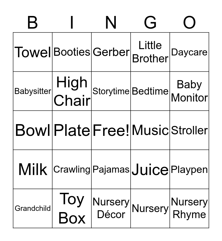 This bingo card has a free space and 118 words: Baby, Cradle, Pacifier, Diapers, Crib, Rattle, High Chair, Baby Food, Carriage, Stroller, Rubber Duckie, Bib, Onesie, Safety Pin, Lullaby, Bottle, Stork, Car Seat, Formula, Baby Powder, Baby Oil, Booties, Maternity, Sleep Sack, Rocker, Grandchild, spoons, Motherhood, Romper, Infant, Bowl, Plate, Nursery Décor, Nursery, Nursery Rhyme, Child, Toddler, Building Blocks, Music, Rocking Chair, Nightlight, Wishes, First word, Pillow, Playpen, Baby Vest, Hiccup, Gerber, Family, Birth Certificate, Smiles, Grandma, Swaddle, Sister, Welcome, Sleep, Cry, Uncle, Auntie, Baby Monitor, Musical Toy, Cup, Humidifier, Grandpa, Love, Blue, Thermometer, Storytime, Bedtime, Parent, Milk, Elephant, Teddy Bear, Daddy, Mommy, Towel, Toy Box, Pajamas, Little Brother, Socks, Baby Shoes, Lotion, Mittens, Massage, Daycare, Tiny Feet, Crawling, Tickle, Body Suit, Baby Gate, Sheets, Bottle Warmer, Bath Robe, Juice, Bath, Babysitter, Teether, Bunny Rabbit, Baby Swing, Changing Table, Wipes, Clothes, Blanket, Plush, Baby Walker, Baby Shower, Giggles, Newborn Diaper Bag, Bouncer, Bassinet, Sandals, Bath Tub, Washcloth, Memory Book, Sippy Cup, Baby Boy, Photo Frame and Baby Brush.