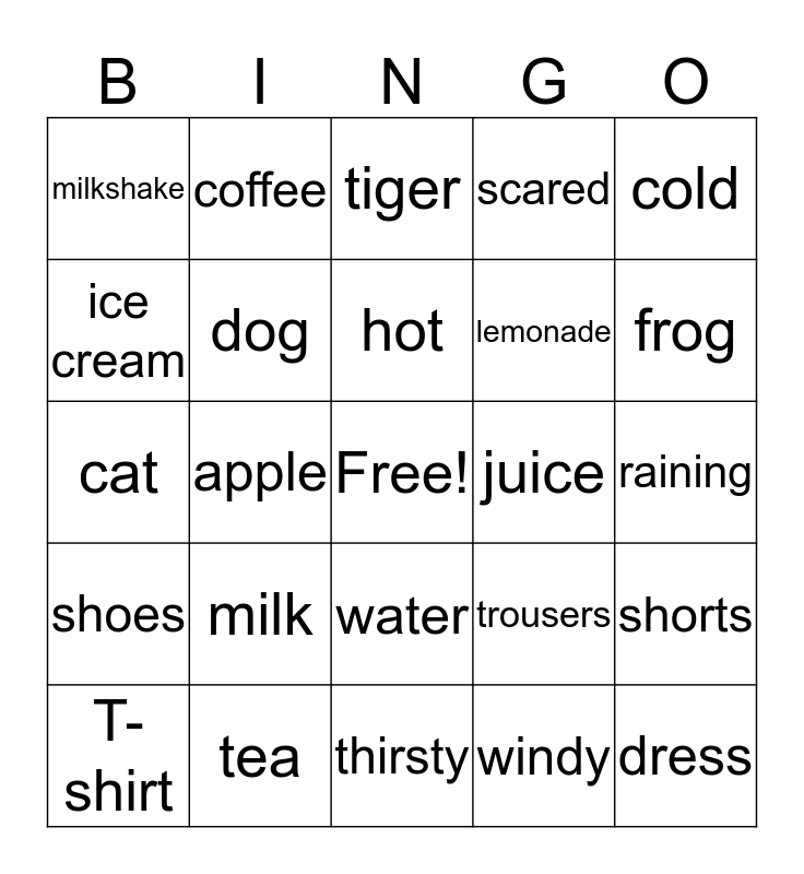 This bingo card has a free space and 24 words: milk, tea, hot, T-shirt, cold, milkshake, ice cream, coffee, juice, water, lemonade, cat, trousers, shorts, dog, windy, raining, tiger, frog, apple, dress, shoes, scared and thirsty.