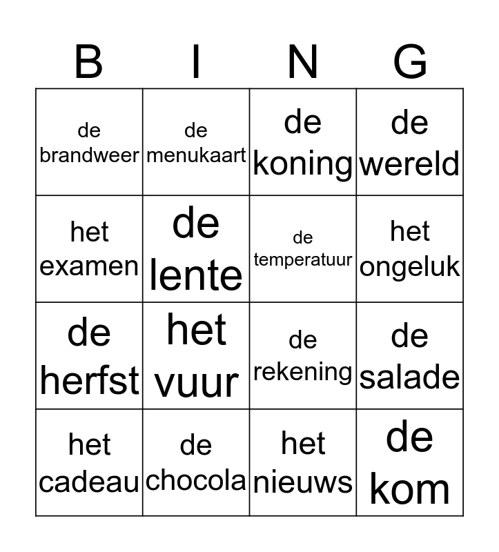 This bingo card has 16 words: het cadeau, de chocola, de koning, de wereld, het examen, de menukaart, de rekening, de salade, de brandweer, de lente, het nieuws, het ongeluk, de herfst, het vuur, de temperatuur and de kom.