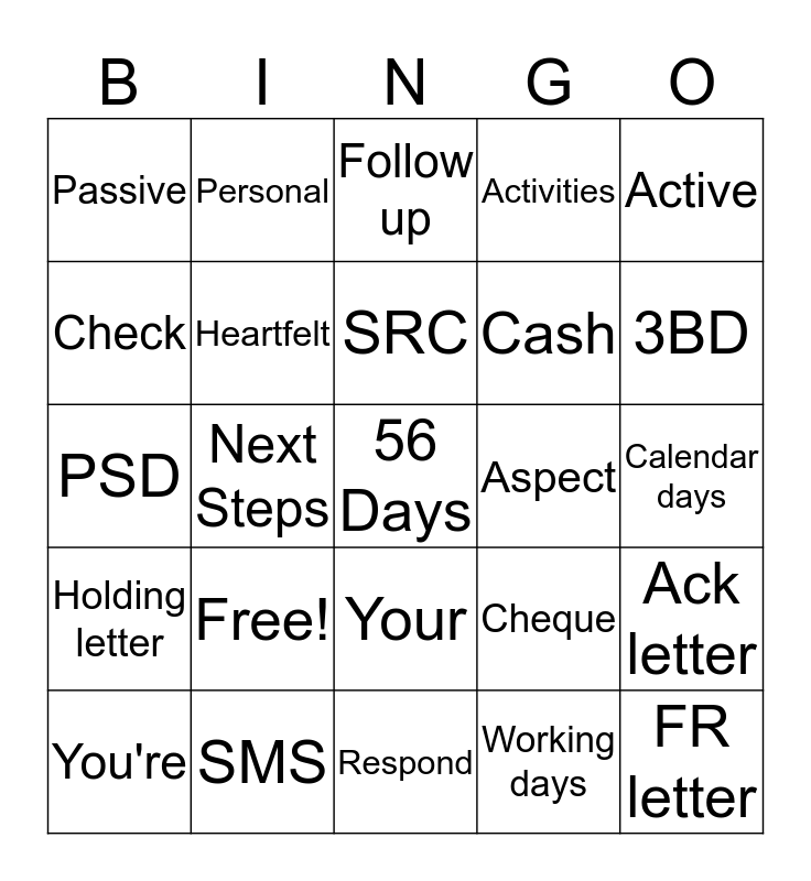 This bingo card has a free space and 25 words: Free!, Respond, SRC, You're, Active, Passive, Check, Personal, Aspect, Your, Cash, PSD, Cheque, Ack letter, Heartfelt, TOV, Calendar days, Follow up, 3BD, Next Steps, FR letter, SMS, Holding letter, Activities and Working days.