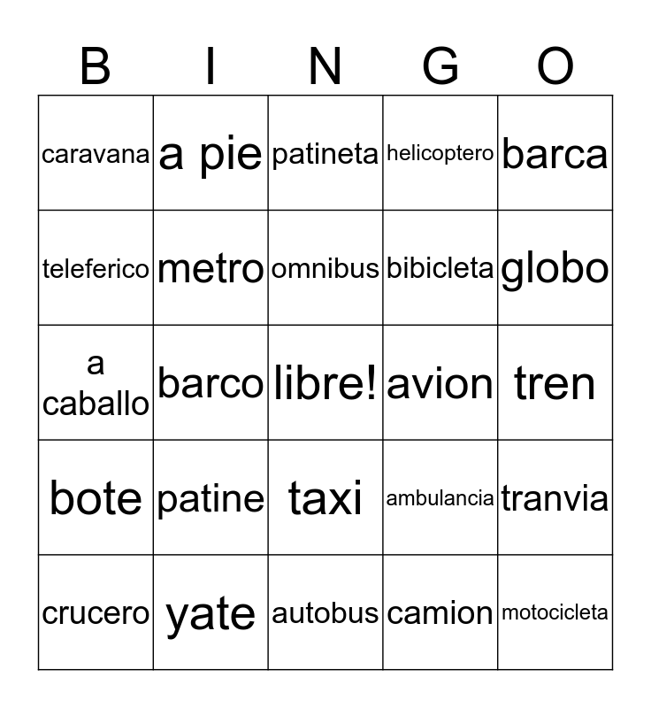 This bingo card has a free space and 34 words: camioneta, coche, automovil, carro, tren, teleferico, metro, autobus, bibicleta, motocicleta, a caballo, a pie, camion, limusina, bote, barco, taxi, avion, tranvia, crucero, yate, lancha, helicoptero, globo, cohete, patine, patineta, furgoneta, barca, caravana, avioneta, omnibus, ambulancia and camion de bomberos.