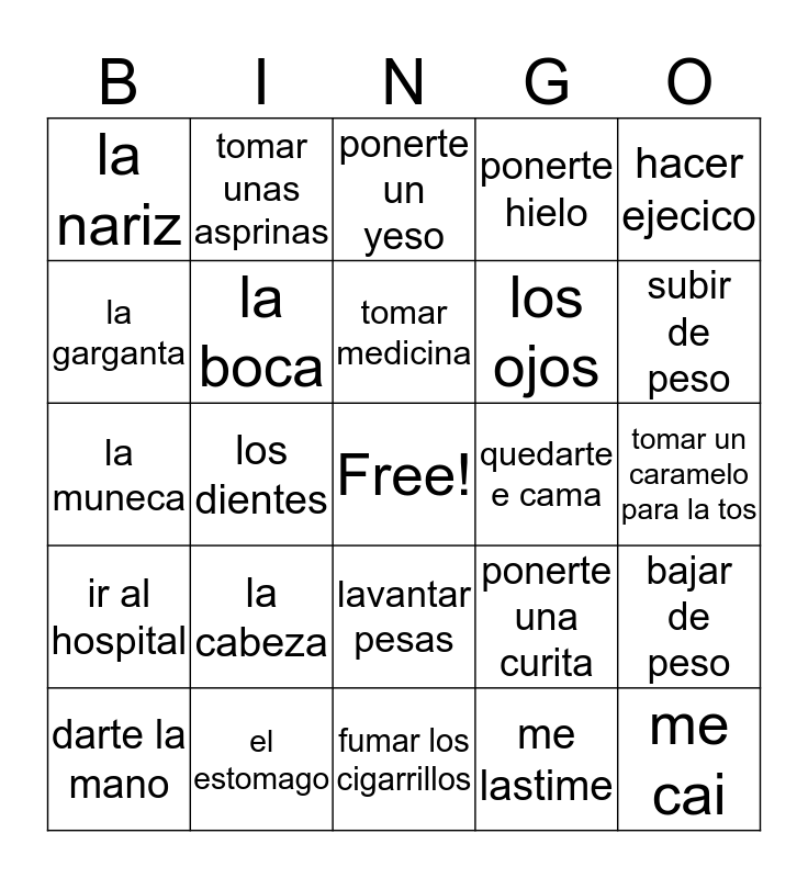This bingo card has a free space and 24 words: la cabeza, el estomago, tomar medicina, darte la mano, hacer ejecico, la nariz, la garganta, tomar unas asprinas, quedarte e cama, lavantar pesas, los ojos, la muneca, ponerte una curita, bajar de peso, la boca, me lastime, tomar un caramelo para la tos, ponerte un yeso, subir de peso, los dientes, me cai, ir al hospital, ponerte hielo and fumar los cigarrillos.